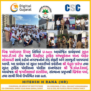 વિશ્વ પર્યાવરણ દિવસ નિમિત્તે U-tern આયોજિત કાર્યક્રમમાં સુરત આર.ટી.ઓ ટીમ અને District Traffic Education and Walfare Society સાથે રહીને નગરજનોને રોડ સેફ્ટી અંગે સમજૂતી આપવામાં આવી. આ કાર્યક્રમ માં સુરત આરટીઓ કચેરીના શ્રી મેહુલ પારેખ તથા સુરત ટ્રાફિક પોલીસના પોલીસ ઇન્સ્પેકટર શ્રી જે.એન.દેસાઈ, આયોજક શ્રી જગદીશભાઈ ઇટાલિયા, સંસ્થાના પ્રમુખશ્રી બ્રિજેશ વર્મા, તથા સાથી મિત્રો ઉપસ્થિત રહ્યા હતા.